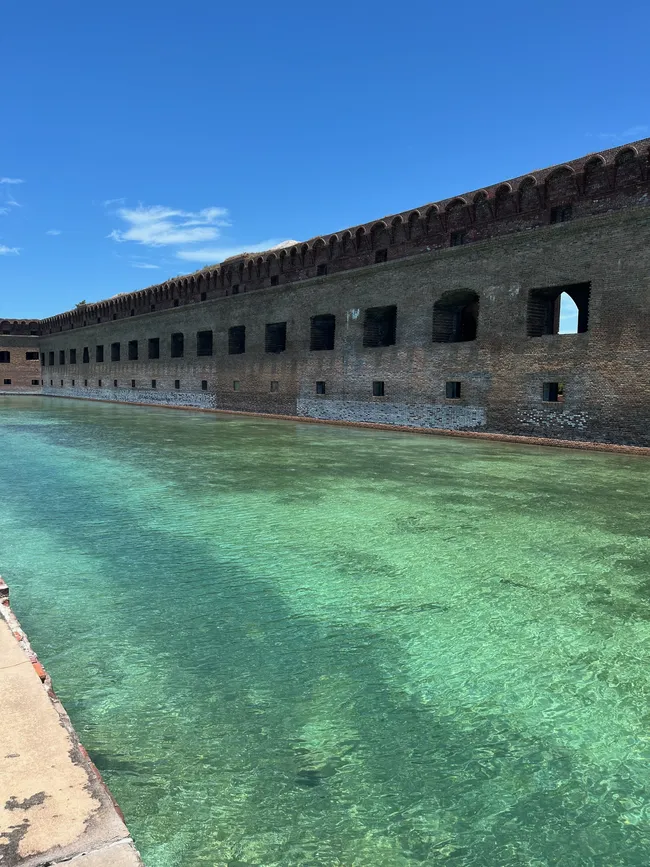 The moat wall at Fort Jefferson is a scenic walkway and popular snorkeling spot offering stunning views of the surrounding turquoise waters.